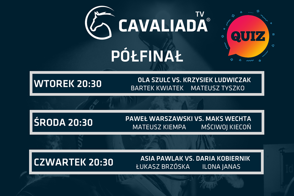 W półfinałach zawodnicy będą musieli odpowiedzieć na 8 pytań dotyczących zagadnień rozrywkowo/jeździeckich. Dodatkowo zaplanowaliśmy po dwa zadania dla poszczególnych par, które będą wymagać umiejętności rysowania i zabawy w kalambury.