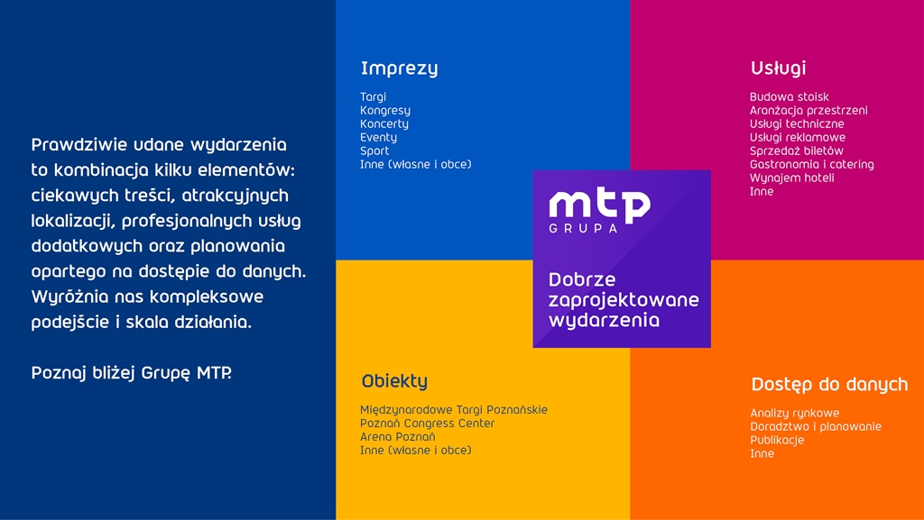 W ramach nowej strategii powstała marka korporacyjna – Grupa MTP, która łączy w sobie portfolio obiektów (Międzynarodowe Targi Poznańskie, Poznań Congress Center, Arena Poznań) oraz usług (Idea Expo, Restauracje Garden City, City Marketing, ToBilet.pl). Dzięki przejrzystej architekturze marek możliwości Grupy MTP w zakresie kompleksowej realizacji targów, kongresów i eventów są czytelne dla klientów oraz uczestników wydarzeń.