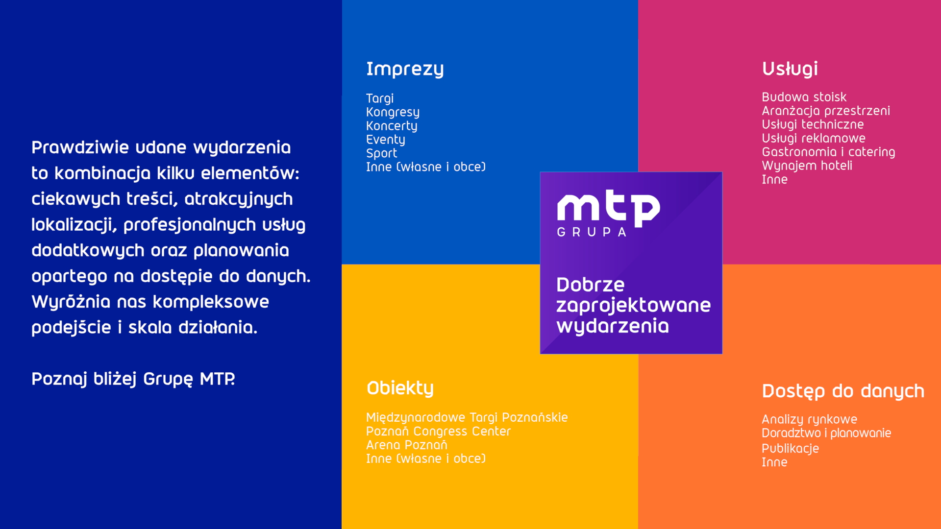 Grupa MTP to z kolei grupa kapitałowa działająca na terenie całego świata. Jej domena działania jest o wiele szersza i obejmuje nie tylko targi, ale też megaeventy, koncerty, zawody sportowe, spotkania firmowe oraz wiele usług towarzyszących, których potrzebują firmy i uczestnicy, by prowadzić biznes, promować się czy po prostu bawić. My wiemy, jak to dla naszych klientów zorganizować. Dlatego motywem przewodnim naszej firmy staje się hasło: Grupa MTP. Dobrze zaprojektowane wydarzenia.