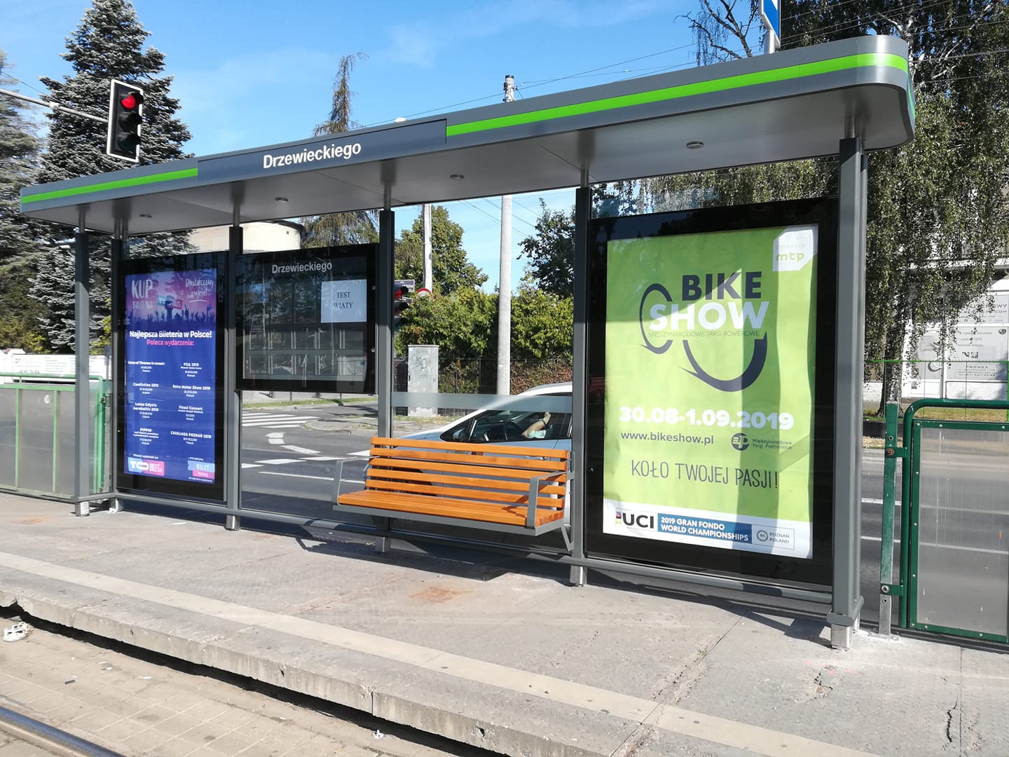 Dwie pierwsze wiaty pojawiły się w ostatni weekend w przestrzeni miejskiej przy ulicy Grunwaldzkiej na przystanku Drzewieckiego. Typowa szeroka wiata została postawiona na przystanku autobusowym. Natomiast testowa wąska konstrukcja stanęła na przystanku tramwajowym w kierunku Junikowa. W weekend trwały prace nad maksymalnym poszerzeniem dachu konstrukcji, przy jednoczesnym zachowaniu bezpieczeństwa pasażerów.